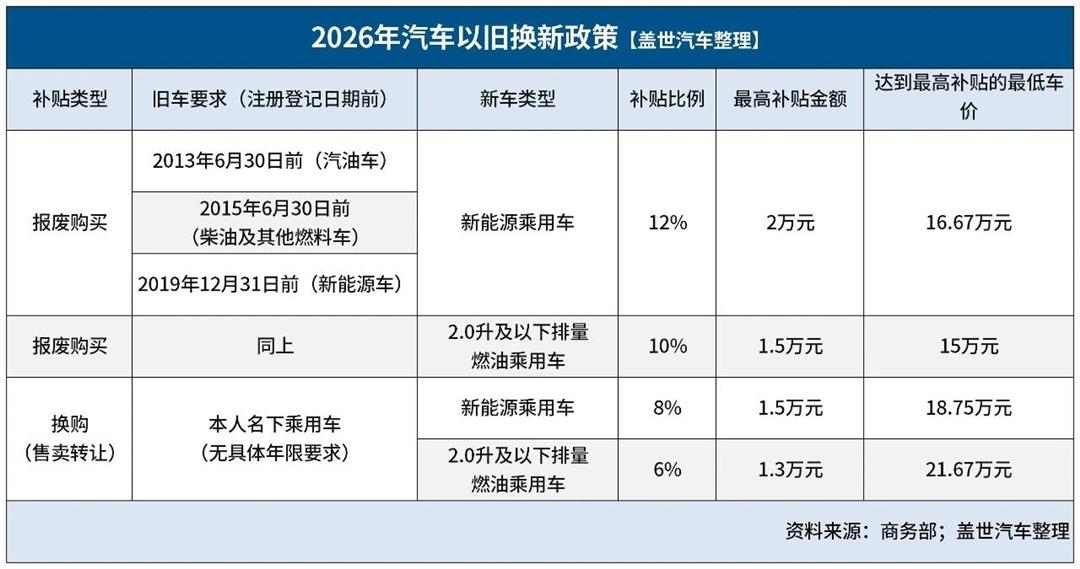 12月30日,商务部等8部门办公厅正式印发《2026年汽车以旧换新补贴实施细则》的通知,新政将于2026年1月1日起实施。与2025年相比,2026年政策在补贴范围、补贴标准和监管机制等方面进行了多项优化,进一步刺激汽车消费市场活力。