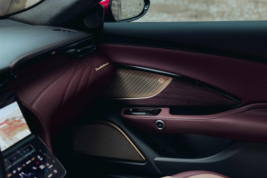 镀铬件与内饰饰板采用手工镀金工艺处理,为每个表面增添温暖与深度,包括Sonus faber势霸音响系统的格栅也采用相同涂装。车门与仪表盘面板覆盖着红色涂装杨木实木,致敬意大利制琴工艺与这座城市丰富的音乐遗产,更将势霸音响的声学造诣深度融入