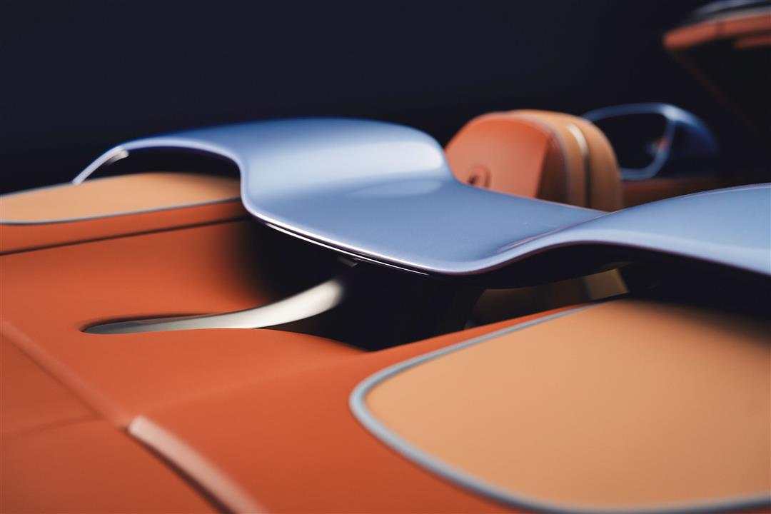 第四台Batur敞篷版的定制配置倾向于奢华美学,采用客户特别指定的三色配色方案,包括一条6毫米的亮银色精致饰线,勾勒出Batur的“无界式发动机罩(endless bonnet)”设计轮廓。车身上部的布雷斯洛蓝(Breslow Blue)精准复刻于顶篷颜色之上,成为首款采用专属配色的顶篷。当顶篷收起时,采用同款精致颜色的风桥(Airbridge)便映入眼帘。外观细节还包括:与车身下部漆色相得益彰的午夜布雷斯洛蓝(Midnight Breslow Blue)发动机罩饰条、轮毂和后视镜上的强调色,搭配钛合金抛光排气管饰件与亮银色格栅,尽显格调。