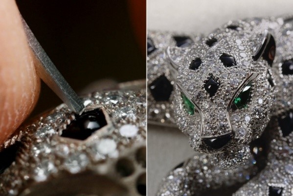 卡地亚猎豹造型作品运用众多精湛工艺,其中最具标志性的是“皮毛”镶嵌工艺。这项技艺为品牌独有,以弯曲的金属细丝环绕宝石,从而营造出动物皮毛的效果。此次“精湛工艺”展区聚焦此工艺,极佳地诠释了塑造自然生灵所需的精准度。每颗宝石皆以纤细的金属丝镶嵌,惟妙惟肖地还原动物皮毛的质感。卡地亚始终以不断创新的精神传承“皮毛”镶嵌工艺,使猎豹的形象焕发灵动生机。