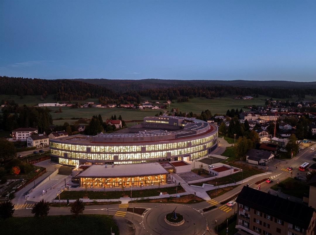 特别设计的生态屋顶不仅为鸟类与昆虫提供了理想栖息地,同时也成为俯瞰汝山谷全景的绿色观景平台。在能源利用方面,建筑不仅回收制表设备余热,更通过连接邻近车站的“Brassus Bois”木柴供热厂,获得完全可再生的补充能源。建设期间,项目还将未受污染的挖掘土方用于区域重大基础设施工程,有效减少了施工对环境的影响。此外,超出法定要求安装的大面积光伏发电系统,进一步为制表厂注入了清洁能源。