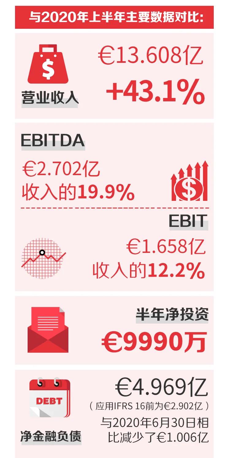 税息折旧及摊销前利润(EBITDA)为2.702亿欧元(EBITDA利润率:19.9%)而2020年上半年,税息折旧及摊销前利润(EBITDA)为1.433亿欧元(EBITDA利润率:15.1%)。