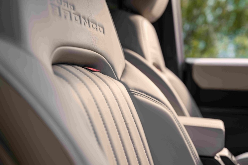 车内,福特烈马1966的内饰哲学与高级定制时装有着异曲同工之妙。其座椅造型汲取了众多顶级经典家具的设计灵感,兼具出色的设计感与乘坐舒适性;边缘采用的专属绲边工艺开发周期超6个月,工匠将误差控制在0.01mm以内,确保每一道曲线顺滑精致,标准甚至超越顶级奢侈品牌。同时,座椅绗缝工艺针对宽度、细节与角度历经10次验证打样,耗时10个月最终定型,配合“Bronco”专属身份铭牌与定制红色刺绣标牌,宛如高定礼服上手工缝制的品牌标签,于低调中彰显尊贵,在细节之处点睛奢华。