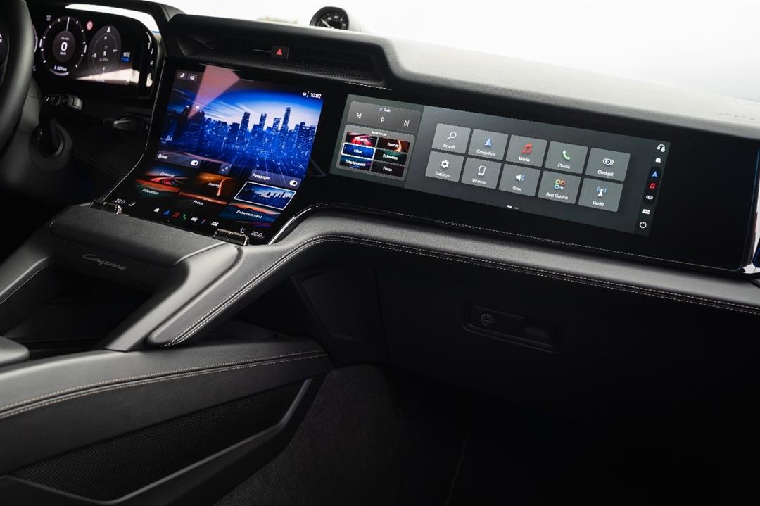 新车内饰中央控制区域使用了OLED技术的流线型曲面显示屏,中控屏显示面积相较于燃油版Cayenne增大50%,可实现像素级精准发光。流动中控屏的界面也可以进行个性化色彩选择。车内还配备了14.25英寸全数字化仪表组和标配的14.9英寸乘客显示屏。搭载的增强现实抬头显示系统可将导航信息直接投射至前方视野。基于本土优化的语音助手支持多意图指令与持续聆听,捷行心境模式可一键营造沉浸式座舱体验。内饰表面加热功能、滑动式全景天窗搭载可变光线控制功能等舒适配置,进一步提升了座舱的科技感与豪华感。
