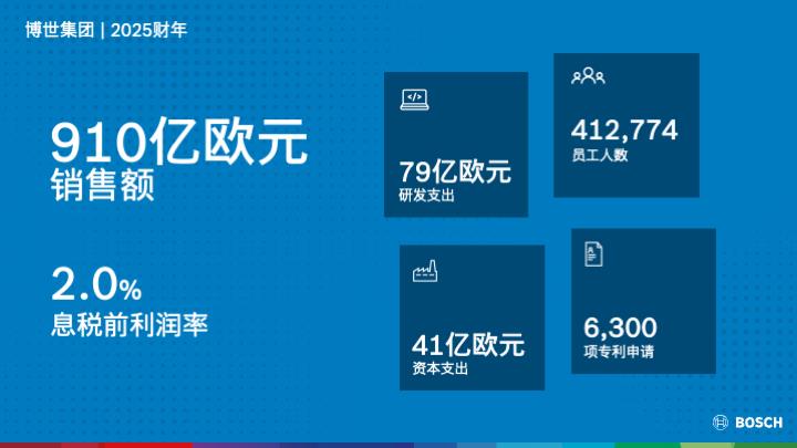 在创新实力方面,博世是全球最强大的工业企业之一,也是欧洲最高产的专利申请者之一。2025年,博世申请了约6300项专利,再次蝉联德国专利申请榜首。尽管面临巨大挑战,博世在2025财年仍实现了910亿欧元的销售收入,较上一财年略有增长(2024年:903亿欧元)。剔除汇率影响后同比增长4.1%。2025年息税前利润率为2%,低于上一年水平(2024年:3.5%)。为了提升未来竞争力而进行的必要结构性调整和人员优化,但由此计提的27亿欧元的准备金对整体的业绩造成了显著的负面影响。