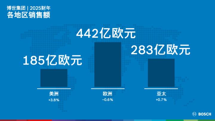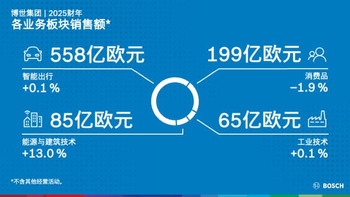 各业务板块的销售表现受到主要市场经济疲软和负面汇率影响的制约。智能出行业务销售额为558亿欧元,微增0.1%,调整汇率影响后实现2.9%的增幅;息税前利润率为1.8%(2024财年为3.8%)。工业技术业务销售额为65亿欧元,微增0.1%,调整汇率影响后增长2.4%。主要受北美市场下滑影响。息税前利润率升至3.5%(2024财年为1.2%)。消费品业务销售额为199亿欧元,同比下降1.9%,调整汇率影响后增长4.1%。主要受中国和美国建筑行业低迷影响。息税前利润率3.0%(2024财年为3.5%)。能源与建筑技术业务销售额为85亿欧元,同比增长13.0%,调整汇率影响后增长了15.6%。息税前利润率0.5%(2024财年为4.9%)。受并购与销售活动产生的一次性成本影响显著。