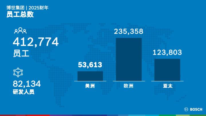 截至2025年年底,博世集团在全球范围内共有412774名员工(2024年为417859人)。员工总数下降了约1%,较上一年减少了5085人。人员调整主要集中在智能出行业务领域,德国区域受影响最为明显。