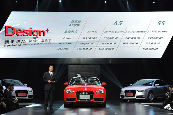 2012年2月28日,在中国潮流前沿、先锋艺术胜地——北京798艺术区,最具优雅运动魅力的轿跑车——新奥迪A5/S5系列车型焕然上市。一汽-大众奥迪宣布此次上市的新奥迪A5家族包含三种车身形式和四种动力与驱动组合的11款车型,价格区间为49.98万元至85.8万元。