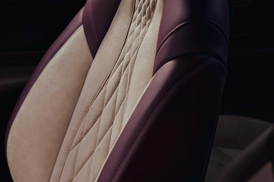 真皮采用定制酒红色,搭配裸色Alcantara材质——触感如同优雅剧院的座椅般柔软。缝线与深波尔多红饰条唤起了剧院的色彩、氛围与精致感。