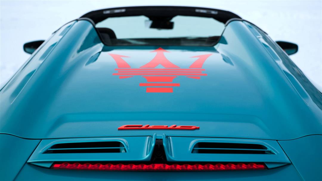 驼峰式后舱盖上的橙色三叉戟徽标、外部标识、玛莎拉蒂字母以及Cielo徽标,共同构成了醒目而独特的图形元素,于皑皑雪境中卓然生辉。高光黑色下包围与20英寸Cyclonic高光黑色Fuoriserie专属轮辋相得益彰,辅以橙色制动卡钳,及同色呼应的橙色轮毂盖与三叉戟精饰细节,令这份视觉冲击力再度进阶。
