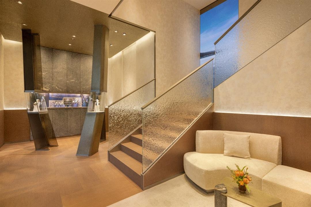 步入其中,层层递进的发现之旅随之展开。接待区拥有舒适的休息座椅,纹理玻璃设计令人联想到汝山谷中的潺潺流水。空间中央,极具雕塑感的树状装置,以现代手法重释爱彼制表工坊四周的自然风光。棱角分明的树干承托起一个个水晶材质展示柜,陈列其中的最新时计作品仿佛悬浮其间,向欣赏者近距离展现高级制表的艺术造诣。
