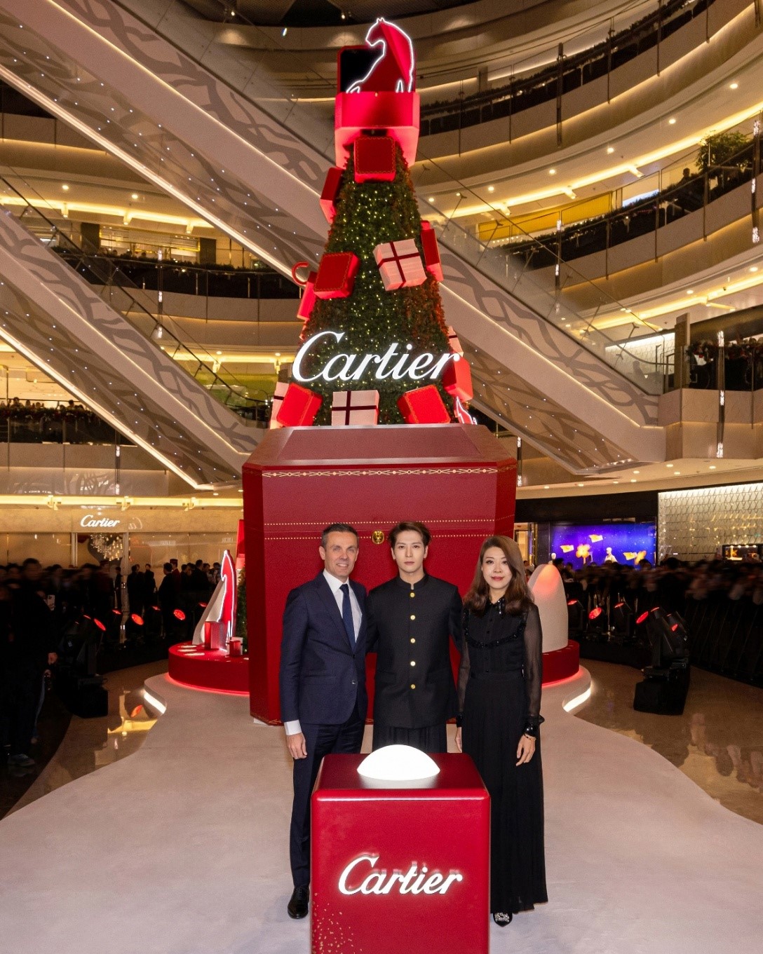 ▲11月25日,(从左至右)卡地亚中国首席执行官柯瑞诺(Bruno Carraz)先生、卡地亚品牌大使王嘉尔先生与新鸿基地产代理有限公司租务部总经理李咏思女士共同出席卡地亚节日亮灯仪式