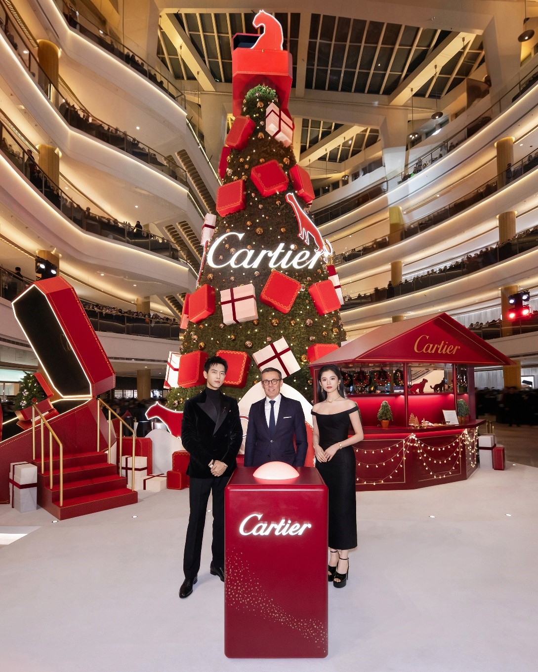 ▲11月29日,(从左至右)卡地亚品牌大使李现先生、卡地亚中国首席执行官柯瑞诺(Bruno Carraz)先生与卡地亚品牌大使张婧仪女士共同出席卡地亚节日亮灯仪式