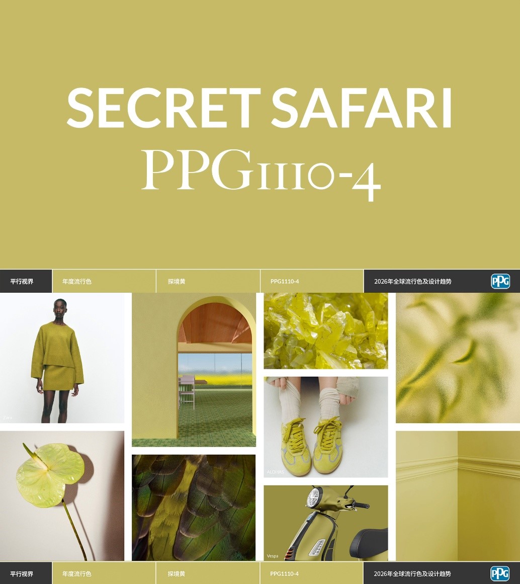 PPG(纽约证券交易所代码:PPG)近日正式发布 2026 年度色彩——“探境黄”(Secret Safari,色号PPG1110-4)。这款百搭的黄绿色调,巧妙融合了舒缓宁静与灵动活力,可广泛适配各类应用场景。值得关注的是,该色调隶属于PPG 2026年全球色彩主题