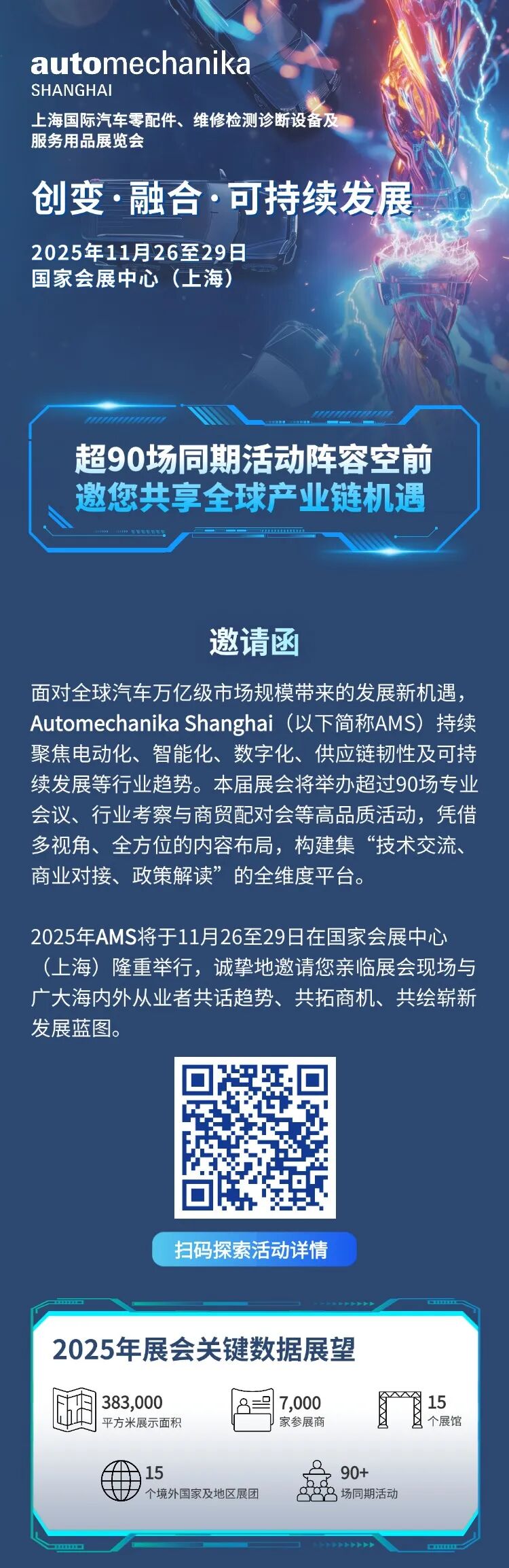 面对全球汽车万亿级市场规模带来的发展新机遇,Automechanika Shanghai上海国际汽车零配件、维修检测诊断设备及服务用品展览会(以下简称AMS)持续聚焦电动化、智能化、数字化、供应链韧性及可持续发展等行业趋势。本届展会将举办超过90场专业会议、行业考察与商贸配对会等高品质活动,凭借多视角、全方位的内容布局,构建集“技术交流、商业对接、政策解读”的全维度平台。
