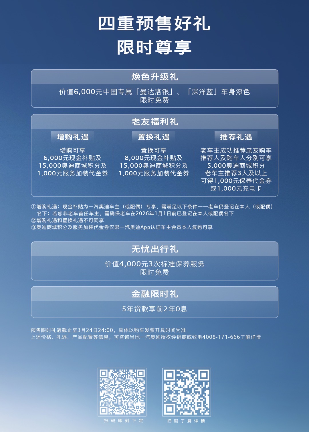 为致敬时代精英的青睐与信赖,一汽奥迪还同步推出了全新奥迪A6L专属预售权益。即日起至3月25日24:00,用户下订即可尊享焕色升级礼、老友福利礼、无忧出行礼、金融限时礼,所有权益均覆盖臻选型、尊享型、quattro 尊享型、3.0T quattro 旗舰型全系车型,以高价值福利的层层加码,赋能价值创造者,将让每一位全新奥迪A6L车主的豪华体验全方位进阶。